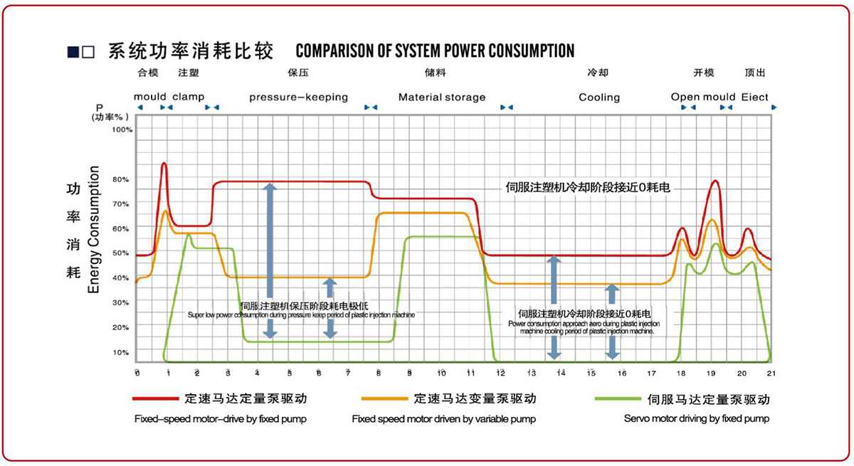 大幅節(jié)能:在等條件下,相比傳統(tǒng)定量泵注塑機(jī)節(jié)能 20%-80%